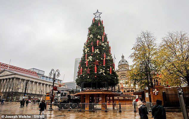 Uma árvore cívica foi plantada fora dos escritórios da Câmara Municipal de Birmingham, enquanto bancas de mercado também estão sendo montadas para a época festiva.