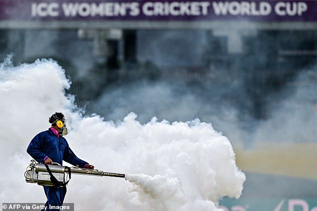 Ele teve um efeito limitado e, após 34 overs, o jogo foi interrompido em uma máscara de gás para permitir que um homem entrasse na área do jogo com uma máquina apontadora, que cobre grandes áreas do campo com fumaça intrai-entrante.