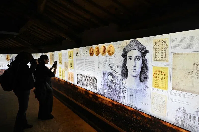 Pessoas ficam diante de uma imagem que retrata a história do artista Rafael durante uma prévia para a imprensa do projeto “Além do Visível” dentro da cúpula do telhado do Vaticano.