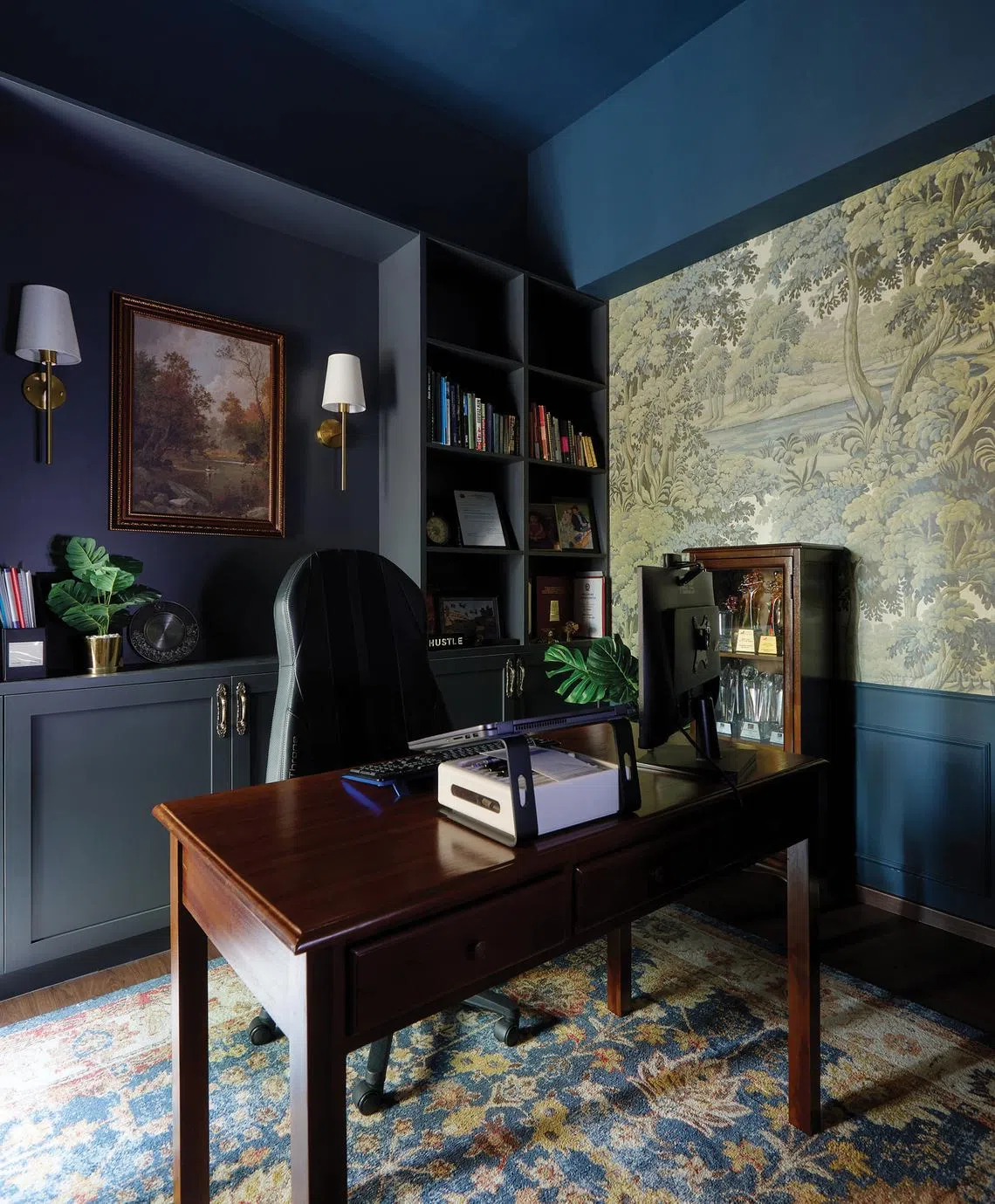 O terceiro quarto é o escritório em casa. As paredes azuis da Marinha e a carpintaria embutida criam uma atmosfera de queda com os tons de ouro do papel de parede e o tapete que capta os detalhes em azul marinho e dourado.