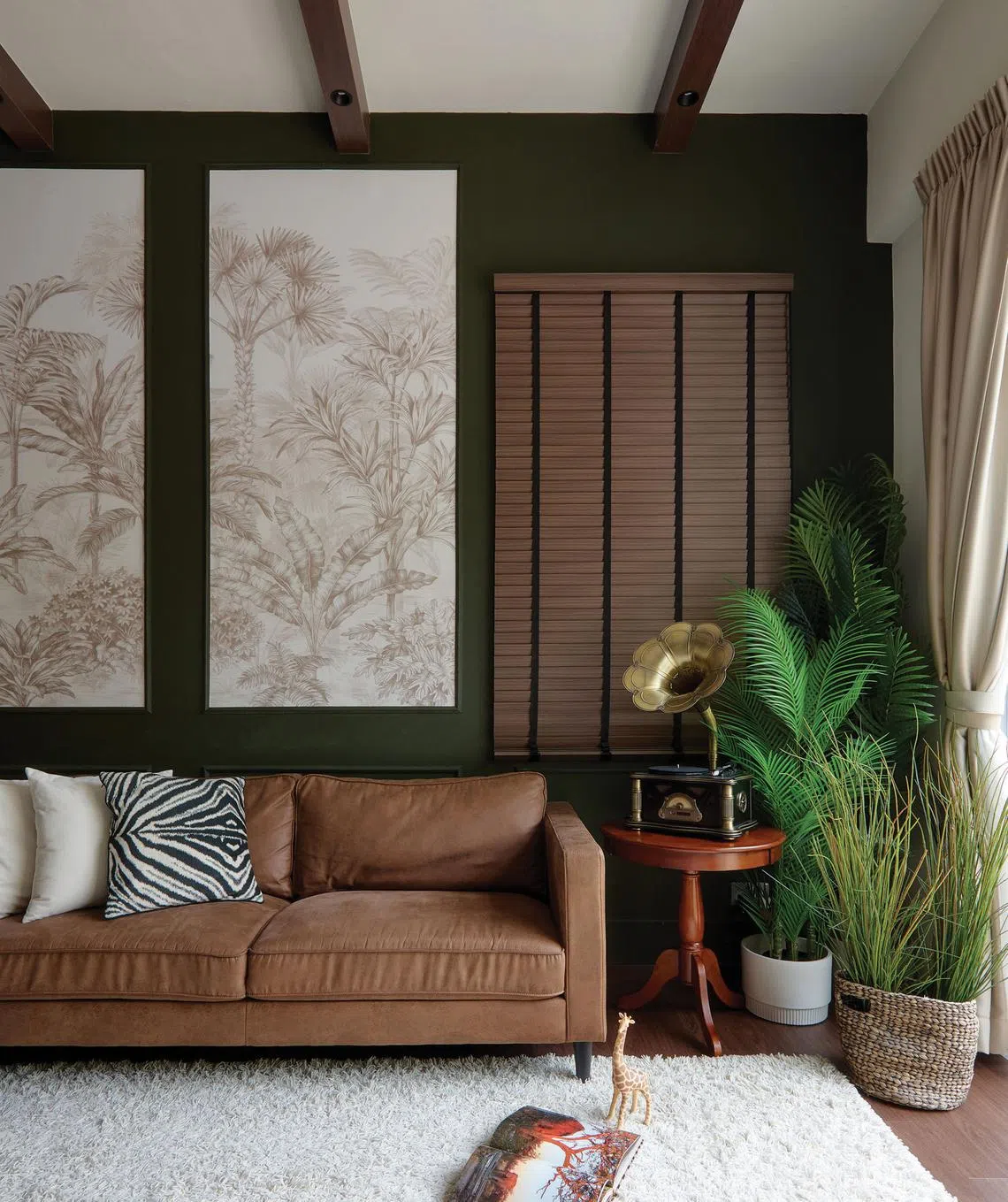 Os painéis verdes continuam na área de estar. A representação monocromática das folhas da selva é realizada em um estilo semelhante à gravura. As vigas de teto de madeira acrescentam um toque rústico, mas também servem a propósitos práticos. Abriga a iluminação embutida.