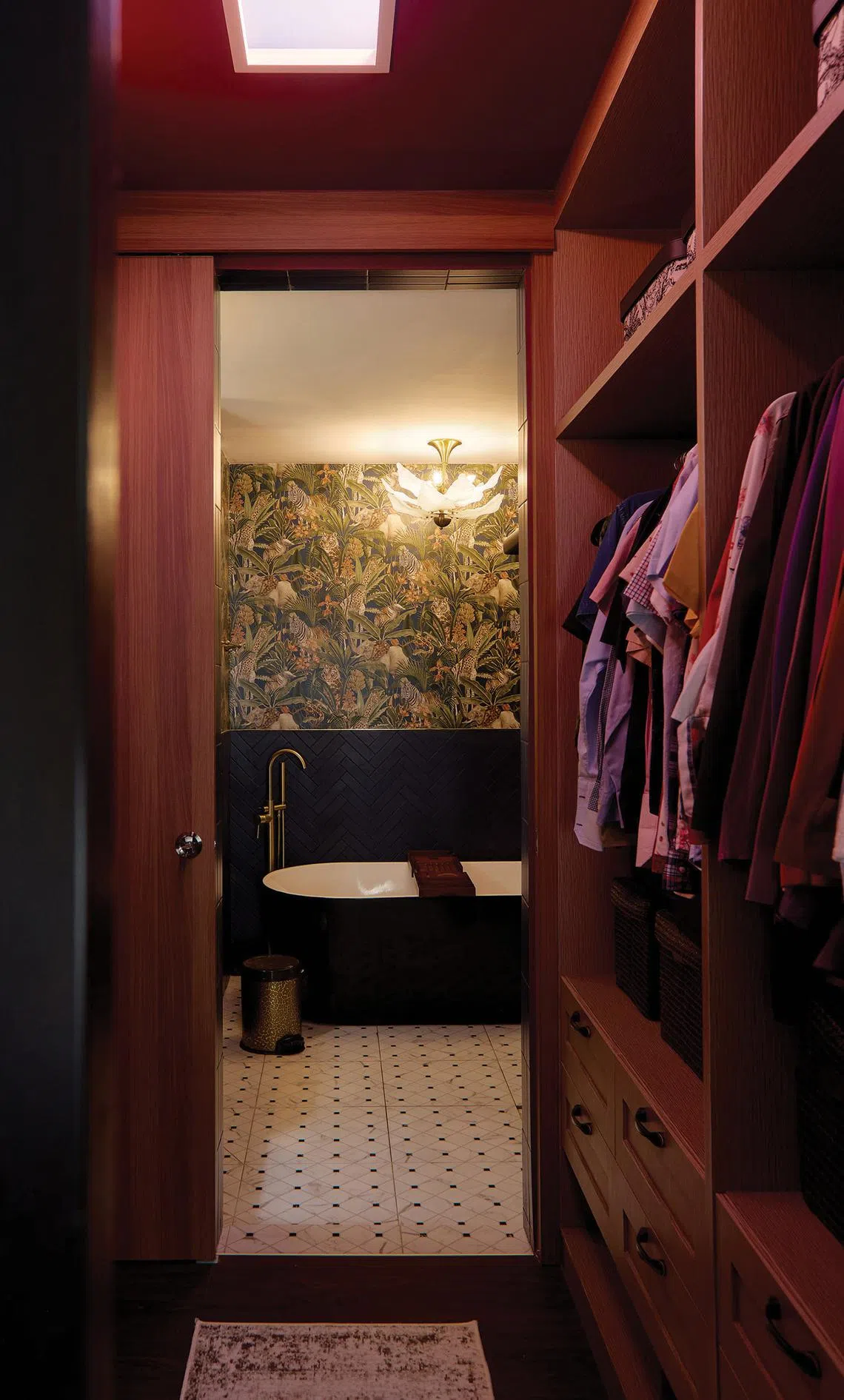 As paredes originais do guarda-roupa de Walk-in foram deslocadas para expandir o espaço. O espaço é cercado por papel de parede vermelho profundo e possui uma penteadeira semelhante a um boudo iluminada por clarabóias artificiais.