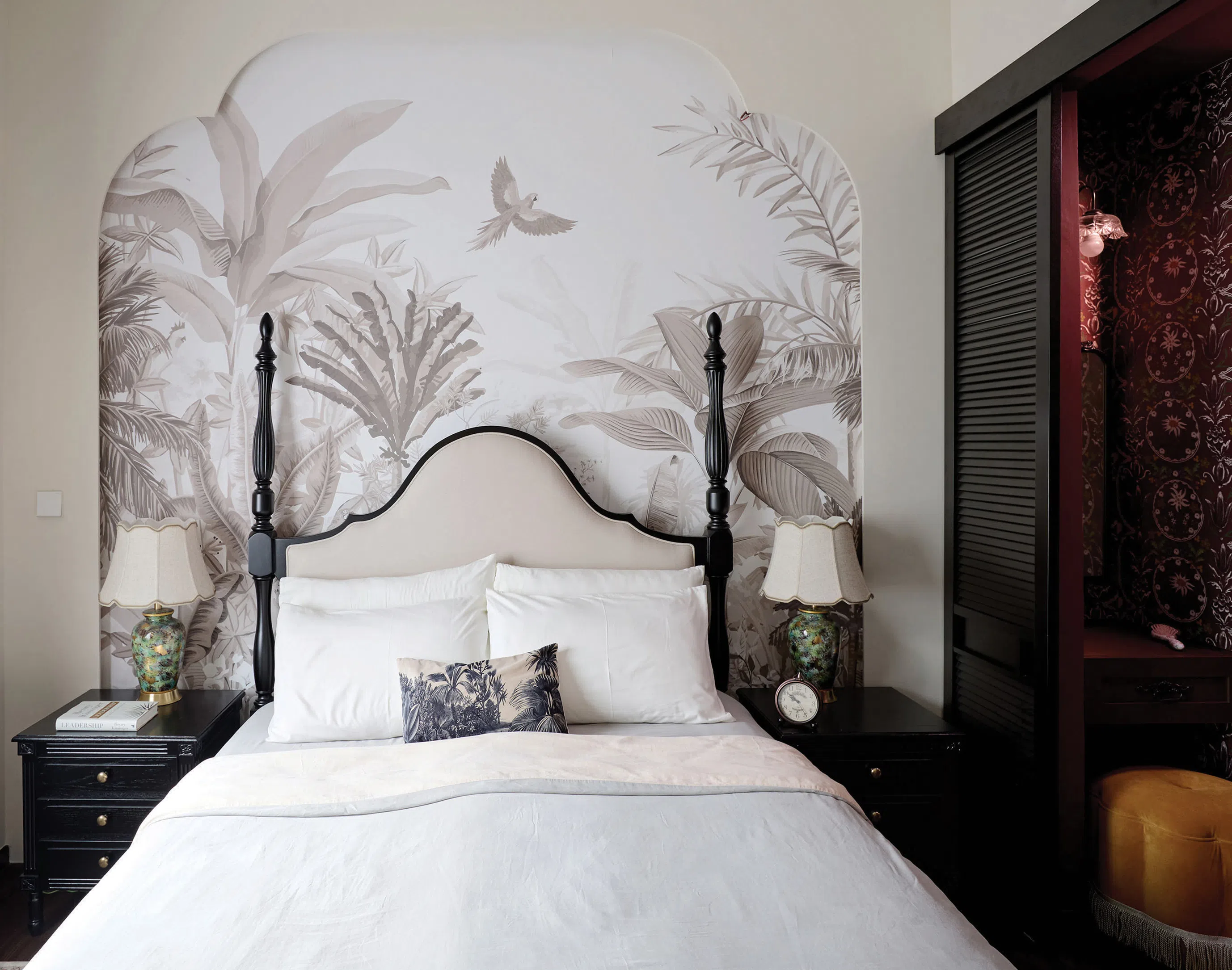 O quarto principal tem muitos encantos do Velho Mundo que transporta os moradores a tempo, com postes de cama ornamentados, mesas laterais antigas e molduras de cama preta e branca com papel de parede com tema da selva.