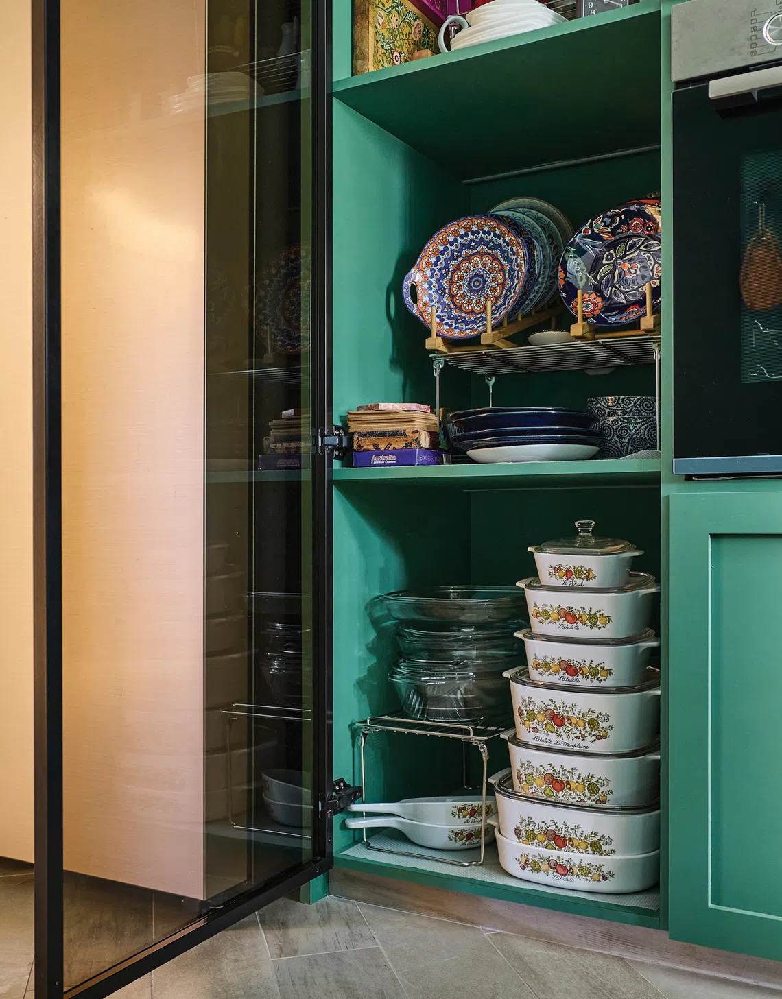 Do outro lado da ilha há uma coleção das tábuas de queijo favoritas de Mash, penduradas em prateleiras de madeira personalizadas. Um armário com frente de vidro contém uma coleção de talheres e porcelanas bem empilhadas.