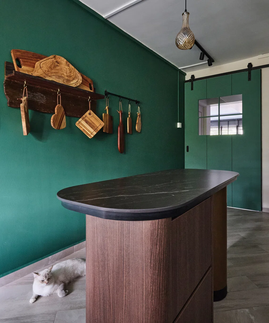 A paleta deste espaço é acolhedora, mas eclética. Os detalhes em madeira assumem a forma de duas mesas de centro assimétricas e uma moldura baixa que sustenta um sofá verde macio. O piso de cerâmica estampado é inspirado nos tradicionais azulejos de cerâmica Peranakan.