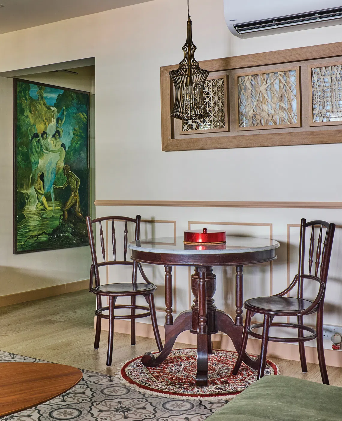 A mesa com tampo de mármore e as cadeiras em tons escuros lembram um conjunto clássico de kopitiam.