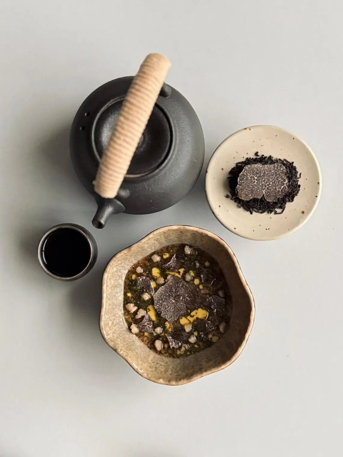 Sr. Gua serve creme de ovo com manteiga marrom coberto com trufas pretas com consomê de frango.