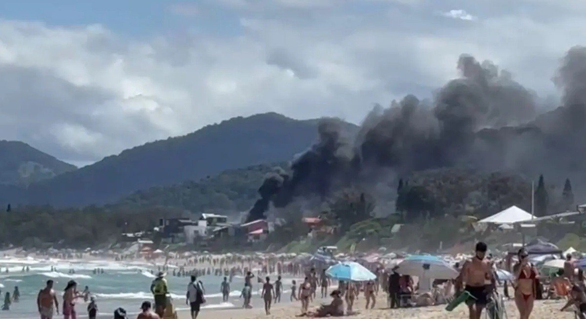 Colunas de fumaça registradas entre banhistas na praia do Campeche, em Florianópolis Um incêndio residencial mudou o cenário na tarde deste sábado (24), uma das praias mais movimentadas do Campeche, em Florianópolis. As imagens mostram uma coluna de fumaça escura se formando próximo à margem repleta de banhistas (veja acima). Segundo os bombeiros, o incêndio atingiu uma residência de madeira de dois andares e já estava controlado às 15h. Ninguém se machuca. ✅Clique e acompanhe o canal do g1 SC no WhatsApp Segundo a corporação, o incêndio foi registrado na Rua Aroeira do Campo, às 14h25, endereço onde o atendimento continua. Incêndio muda cenário na praia do Campeche, em Florianópolis (SC) Marina Sartori/Arquivo pessoal Coluna de fumaça encanta banhistas que lotam praia turística de Florianópolis Marina Sartori/Arquivo pessoal Vídeo: os mais vistos do g1 SC nos últimos 7 dias