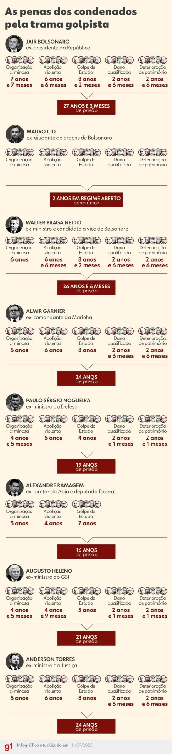 Bolsnaro foi condenado a 2 27 anos e 6 meses de prisão, no sistema de governança primária fechada, pelo crime de golpe, pela degradação da violência das regras democráticas, organizações criminais, danos dignos e degradação da herança listada.
