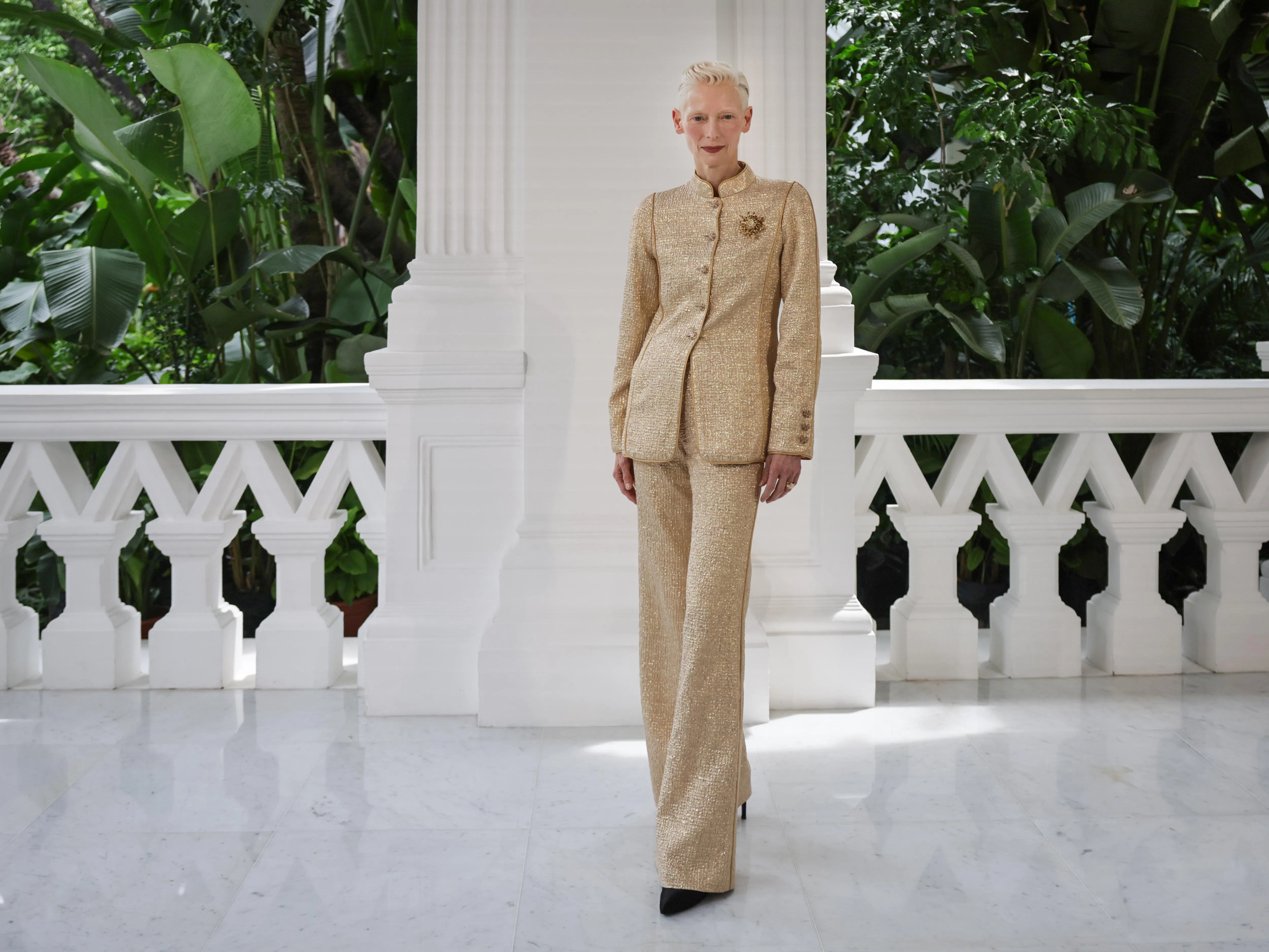 Swinton, embaixadora global da Chanel, descreveu a visão como “um desfile muito cingapuriano”, com os terninhos de lurex dourados da coleção combinando perfeitamente com seu cabelo loiro, sua marca registrada.