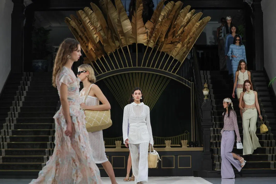 Realizado no Raffles Hotel, o desfile, que estreou em 29 de abril em Villa d’Este, no Lago Como, Itália, evitou a passarela tradicional para um cenário lúdico com modelos caminhando entre mesas e bancos macios dispostos ao redor do pátio do hotel.