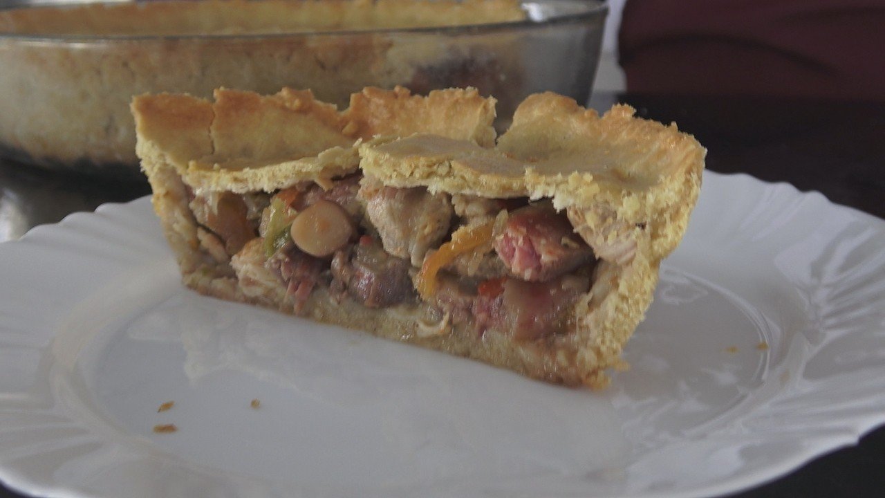 Enquanto isso, aproveite para forrar um prato grande com farinha. Para isso, adicione pedaços de massa, aos poucos, no fundo e nas laterais, pressionando com as mãos. Vale deixar um pouquinho a mais de fora do prato, que será aproveitado posteriormente. Guarde também uma porção para fechar a torta.