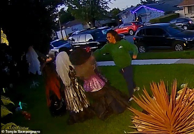 Ela passou por uma casa com lobisomens e esqueletos animados, deu um soco no ar e disse algo inaudível antes de se aproximar do quintal de Tonya Sampognaro, revelaram imagens da câmera da campainha.