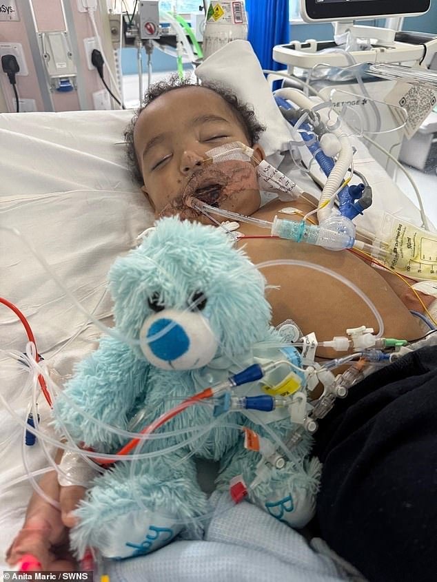 Em Maio, a traquéia, os lábios, a boca e a língua do bebé ficaram gravemente queimados e 27 médicos e enfermeiros lutaram para salvar a sua vida.