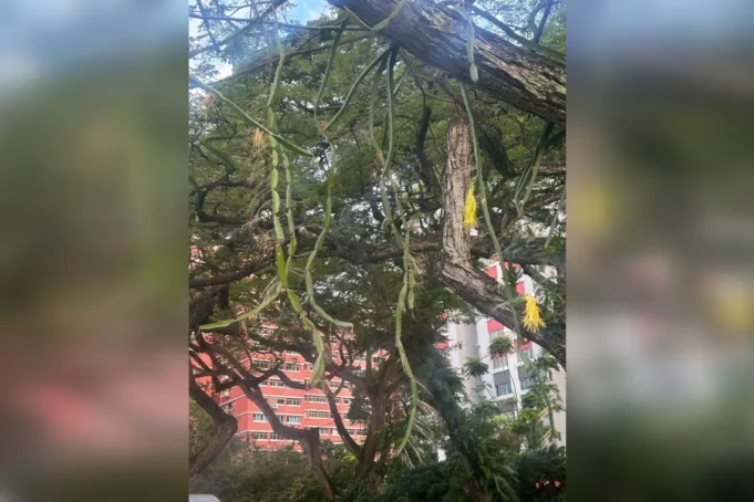 Encontrei uma fruta do dragão crescendo em um galho de uma árvore tropical. Está florescendo e dando frutos. Como isso é possível? O pássaro colocou as sementes no galho?