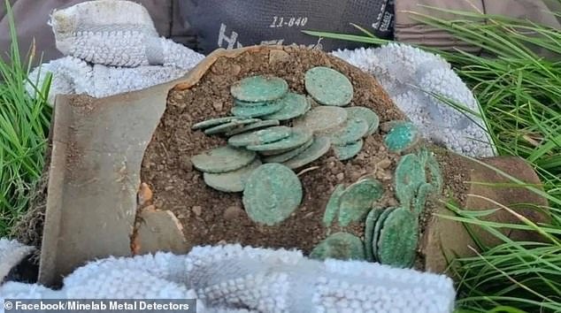Um detector de metais encontrou um tesouro de 15.000 moedas romanas enterradas em dois potes de barro em um campo no País de Gales.