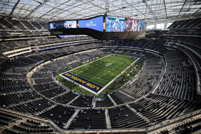 Com cerca de 3,1 milhões de pés quadrados, o SoFi é o maior estádio da NFL, e Demoff disse que seu tamanho é intencional, não apenas para atrair multidões aos domingos, mas para se transformar repetidamente em tudo o que o calendário esportivo exige.
