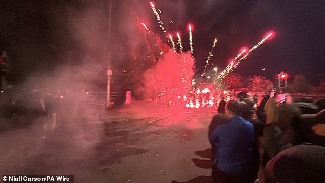 Alguns deles continuaram a atirar tijolos, foguetes, garrafas de vidro e tábuas de madeira contra membros da An Garda Síochána.