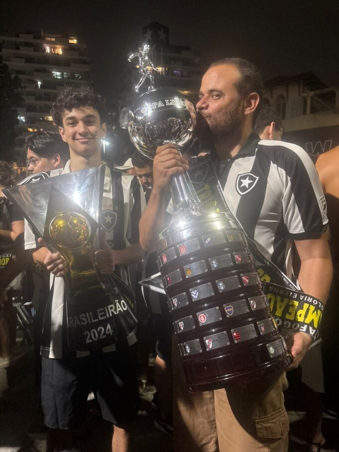 Ao vencer a Libertadores e o Campeonato Brasileiro no mesmo ano, o Glorioso igualou o Santos de Pelé em 1962 e 1963 e o Flamengo de Jorge Jesus em 2019. Torcida do Botafogo comemora mais um título: chegou a vez do Campeonato Brasileiro Botafogo de novo! Em uma semana, a torcida do Glorioso saiu às ruas do Rio para comemorar dois títulos. Depois da Libertadores, foi a vez do Campeonato Brasileiro, conquistado neste domingo (8) após vitória por 2 a 1 sobre o São Paulo, no Estádio Nilton Santos. Centenas de torcedores voltaram a General Severiano, sede do clube social de bairro que dá nome ao clube, na zona sul do Rio, para comemorar mais uma vez. Com camisas, faixas, bandeiras e até réplicas das taças do Brasileirão e da Libertadores, os Botafogenses cantaram o hino do clube e gritaram: ‘Sim, campeões! Sim, campeão!’. Pai e filho comemoram título do Botafogo no General Severiano Arquivo particular com réplicas de taças do Brasileiro e da Libertadores “Indescritível! Um dos melhores momentos da minha vida para comemorar aqui com meus filhos. Não é só futebol!”, disse o administrador Jairo Neto, que é 18 anos comemorou o título com os filhos Cauê e Sofia, de 10 anos. O talismã do Botafogo, a estátua de Manequinho, usava um manto. Camisas de times e faixas de campeonato conquistadas. O Botafogo igualou os recordes do Santos de Pelé em 1962 e 1963 e do Flamengo em 2019 ao vencer a Libertadores e o Campeonato Brasileiro no mesmo ano. Dandara Botafogo! Pais batizam a filha com o nome do time, e bebê ‘Pé Quente’ de 3 meses assiste ao título brasileiro no Estádio Talisma do Botafogo, estátua de Manequinho recebe camisa do time e faixa de campeão Mãe mostra o bebê Pé Quente em arquivo privado intitulado Botafogo