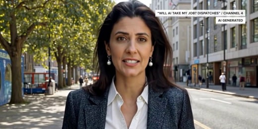 O âncora do AI News apresenta uma transmissão do Canal 4 do Reino Unido sobre AI Taking Jobs