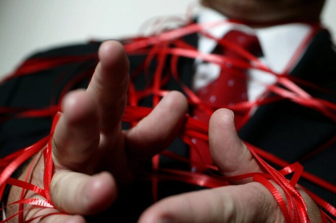 O presidente Trump segura uma tesoura dourada enquanto amarra a burocracia entre duas pilhas de papel que representam as regulamentações governamentais da década de 1960 e as regulamentações atuais na Sala Roosevelt da Casa Branca, em 14 de dezembro de 2017, em Washington, DC.