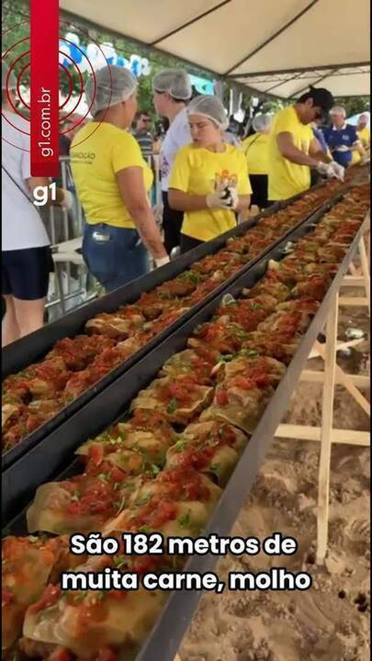 Bife à Parmegiana com 182 metros e peso de mais de uma tonelada Servido em São Jerônimo Mais de 1,5 tonelada de carne, além de centenas de quilos de molho de tomate, queijo e farinha: uma Parmegiana gigante, medindo mais de 180 e servida gratuitamente na região metropolitana de Porto Alegre. Os preparos renderam cerca de 8 mil bifes à parmegiana, que foram distribuídos para moradores da cidade e turistas em evento neste domingo (11). 📲 Acesse o canal g1 RS no WhatsApp Segundo os organizadores do evento, mais de 300 pessoas estiveram envolvidas no preparo de 1,5 tonelada de carne. O chef Eddie Dagre, responsável pela organização do preparo dos alimentos e um dos idealizadores do evento, também deu outros detalhes sobre o esforço. “Foram mais 500kg de molho, 300kg de queijo. Mais 500kg de farinha para empanar os bifes, além de 400 litros de óleo tuácido. É uma proporção ótima para um desafio tão variado”, diz Eddie. Os preparativos começaram por volta das 4h. A carne chegava em caminhão refrigerado, e as primeiras equipes trabalhavam na frente, responsáveis por temperar os cortes e empanar. Bife à parmegiana de 182 m servido no São Jerônimo Reprodução/RBS TV Em seguida, os bifes são grelhados e inicia-se a disposição ao longo de 182 m em assadeira de aço. Como numa linha de produção, os bifes foram espalhados e cobertos com fatias de queijo e cobertos com papel alumínio. É mais perto da hora de servir que entra em cena o molho à bolonhesa, desempenhando uma função essencial na Parmegiana: derreter o queijo. Por volta das 13h chegou a hora de servir. Mais de 5 mil pessoas visitaram o local no domingo, conforme antecipa a Prefeitura de São Jerônimo. Na solenidade de início da distribuição, a administração municipal prometeu que um programa do mesmo modelo deverá ser repetido na cidade no próximo ano. O prato do momento seria outro: lasanha. Parmegiana feita em São Jerônimo bate recorde mundial Breeding/RBS TV Vídeo: Tudo sobre o RS