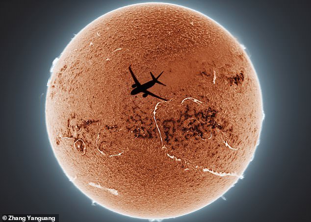 Um sol de destaque tem um voo a jato em frente ao sol, capturado pelo fotógrafo chinês Zhang Youngang