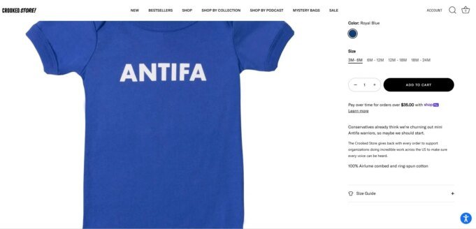 Um porta-voz da Crooked Media disse à Fox News Digital que as roupas listadas em seu site “não são uma piada”, mas também brincou que “todas as crianças são Antifa até que suas almas sejam quebradas pelo capitalismo”.