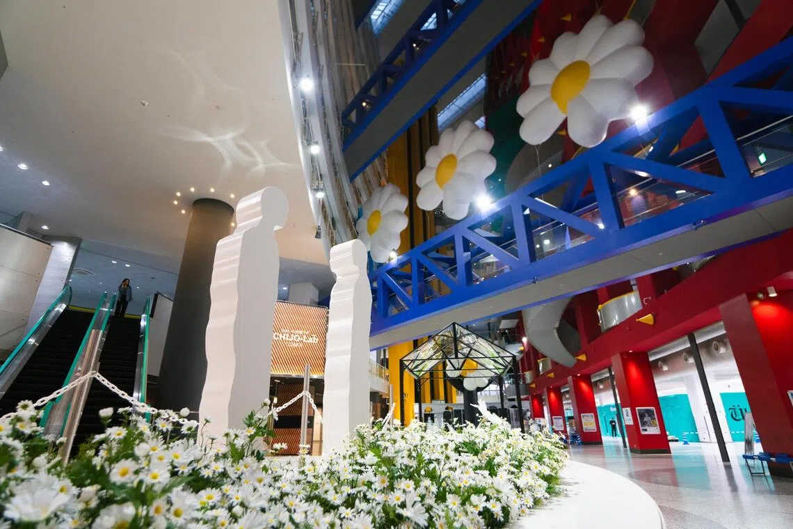 A seção gratuita e sem ingressos do vórtice da chuva no aeroporto de Jewel Changi inclui flores de margarida de 3m de altura e o símbolo de marca registrada do cantor.