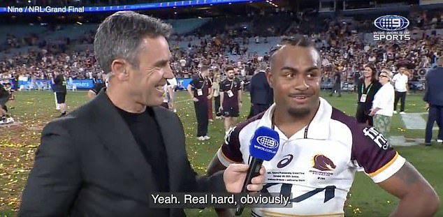 Ezra Maam (pintada, à direita, com Brad Fitter) esqueceu que ele estava ao vivo no canal Nine no domingo à noite, quando a estrela de Footy caiu vários explica durante uma entrevista ao veterano da liga de rugby, Brad Fitter.