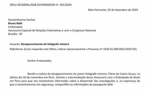Em documento, o governo de Minas Gerais solicita ser informado sobre a investigação do desaparecimento de Flávio de Castro Souza. O brasileiro foi visto pela última vez em Paris no dia 26 de novembro. Arquivo pessoal Flavio de Castro Sousa, 36 anos, desaparecido desde 26 de novembro O governador de Minas Gerais, Romeu Gema (Novo), enviou carta ao Ministério das Relações Exteriores, também conhecido como Itamarati, pedindo informações sobre o caso do fotógrafo Flavio de Castro Sousa, falecido no dia 26 de novembro, está desaparecido em França desde então. Em documento enviado ao Embaixador Bruno Bath, Gemma solicitou a intervenção do Assessor Especial para Assuntos Parlamentares e Federais para manter o governo do estado informado sobre o andamento da investigação do desaparecimento (veja abaixo). Trechos da carta enviada pelo governador Romeu Gema ao Itamarati Reprodução O governador colocou à disposição do Executivo estadual a família brasileira e as autoridades envolvidas para prestar assistência aos necessitados. Nesta quarta-feira (4), Flávio foi incluído na Difusão Amarela da Interpol. A lista contém nomes de pessoas desaparecidas em todo o mundo e forças policiais alertadas nos países membros da organização internacional. Na terça-feira (3), um adido da Polícia Federal brasileira abriu a bolsa do fotógrafo e a examinou em Paris. Porém, segundo o instituto, não foi possível identificar nenhum material que pudesse contribuir para as descobertas. Fotógrafo desaparecido na França une autoridades dos dois países O desaparecimento do fotógrafo brasileiro Flávio de Castro Souza, morador de Belo Horizonte, chegou à capital francesa no início do mês passado e recebeu passagem de volta ao Brasil na mesma data em que desapareceu. Os fotógrafos viajam frequentemente para países europeus a trabalho. O brasileiro foi visto pela última vez em um apartamento alugado por temporada na Rue des Récullets, em Paris. Embora o check-in tenha sido feito junto à companhia aérea para o voo de volta, ele não embarcou. Em mensagem antes de desaparecer, o brasileiro disse a um amigo francês: “Caí em uma ilha do Sena e fiquei lá por três horas, talvez mais. Comecei a gritar até que um homem me ouviu e chamou o corpo de bombeiros”. Troca de mensagens entre brasileiro desaparecido na França e amigo Reprodução/TV Globo “O problema é que meu voo para o Brasil sai daqui a algumas horas e fico preso no hospital até que um médico venha me examinar.” Na última segunda-feira (2), a polícia francesa fez buscas em necrotérios e hospitais, inclusive psiquiátricos, em busca do fotógrafo. Flavio de Castro Sousa, 36 anos, desaparecido desde 26 de novembro Arquivo pessoal O que se sabe sobre o caso do fotógrafo brasileiro desaparecido na França Leia mais: Fotógrafo desaparecido na França incluído na Interpol Yellow Diffusion; Polícia Federal abre malas de fotógrafo brasileiro desaparecido em Paris, família de fotógrafo brasileiro desaparecido na França procura fotógrafo brasileiro desaparecido em Paris Vídeos mais vistos no G1 Minas: