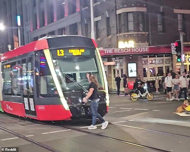 O homem, que algumas testemunhas relataram ter visto em um pub da cidade na noite anterior, foi filmado gritando com pedestres aleatórios e batendo no para-brisa dianteiro de um vagão de trem leve no cruzamento entre Liverpool e George St por volta das 23h da noite de sábado.