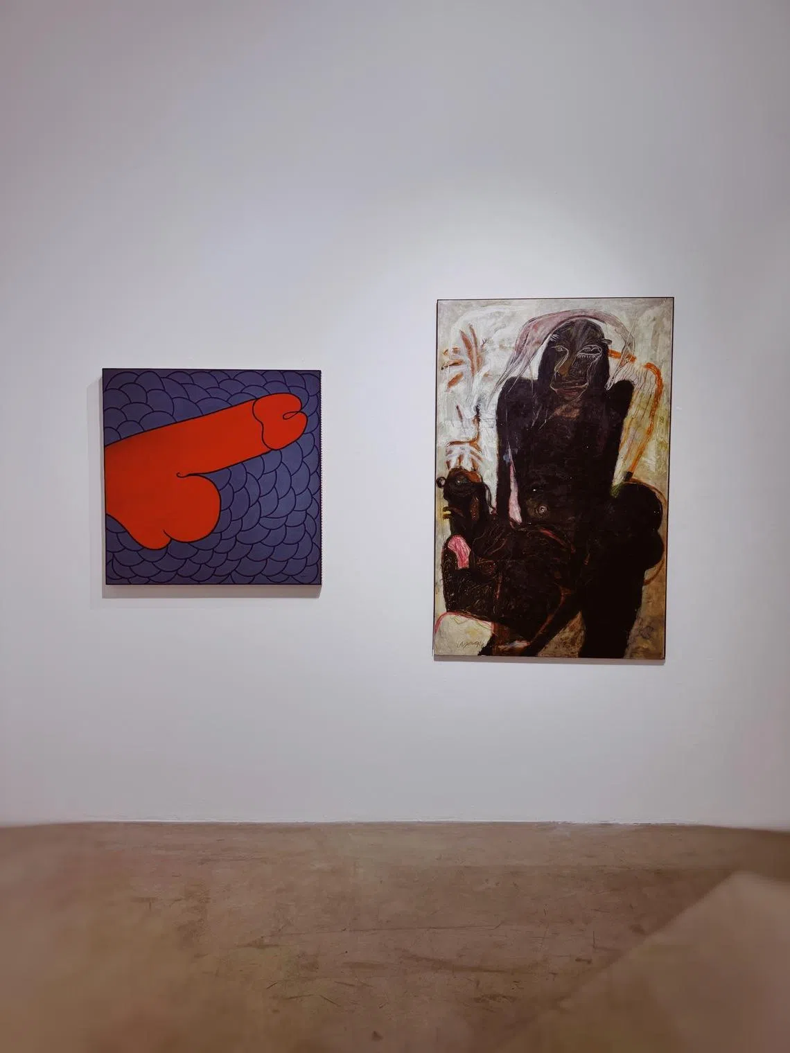 Obras do artista balinês I Gusti Ayu Kadek Murniasi (à esquerda) e do artista indiano Jaya Ganguly (à direita) estão em exibição na Galeria Gajah.