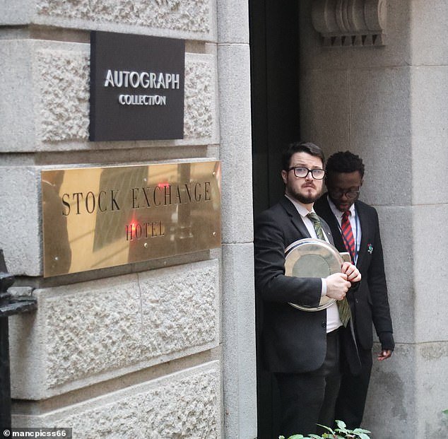 O coproprietário da League Two Salford City, que construiu um enorme império imobiliário em Manchester desde que se aposentou do futebol, contou como ele ‘imediatamente’ retirou a bandeira da Union Jack que estava hasteada perto de um de seus canteiros de obras (Foto: Segurança fora do hotel)