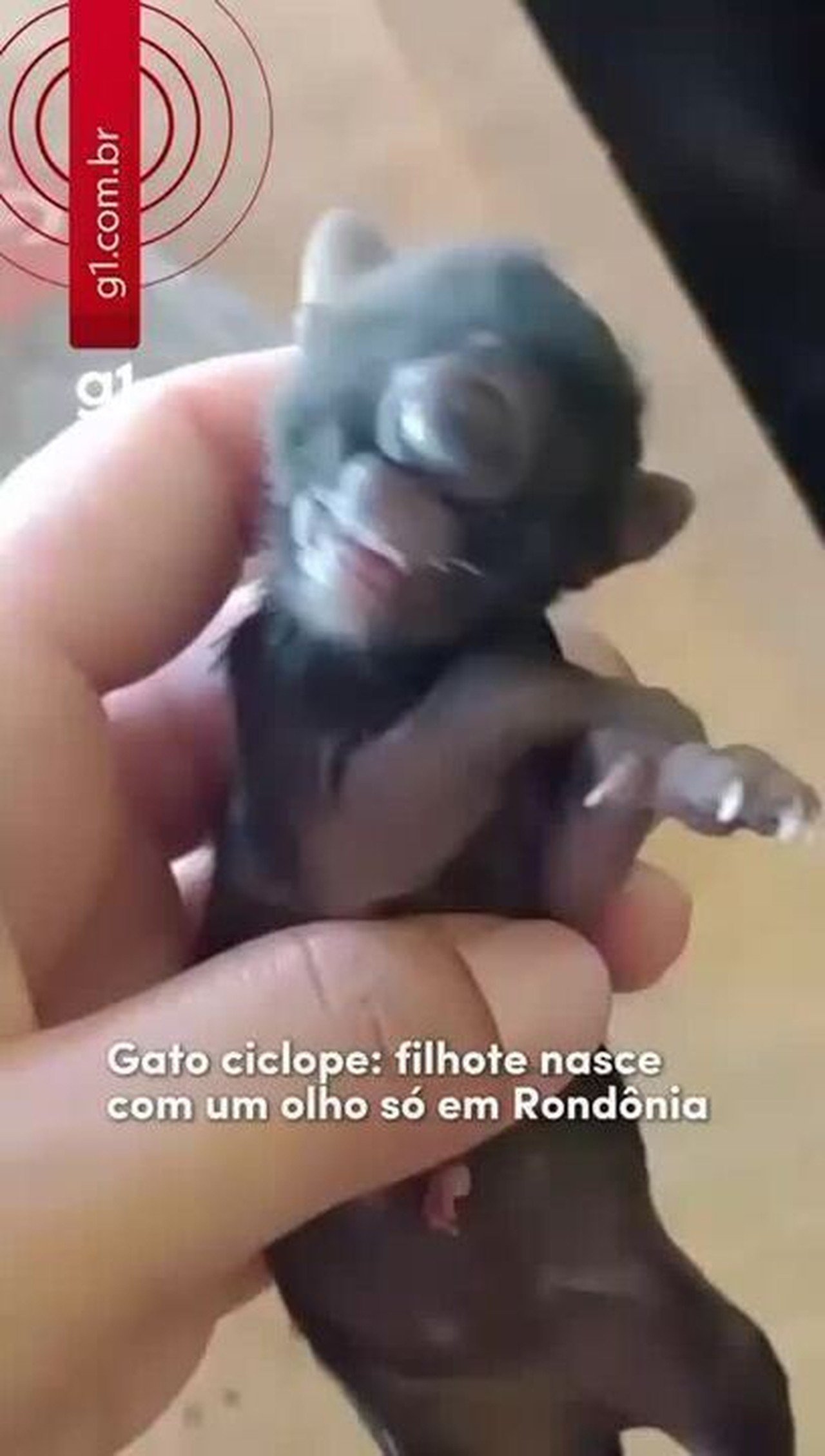 ‘Gato Ciclope’: gatinho nasce com apenas um olho em Rondônia Na última terça-feira (4) moradores do bairro Nova Conquista, no interior de Vilhena (RO), chamaram a atenção para um fenômeno raro: um gatinho que nasceu com apenas um olho. Gilberto Almeida, dono da mãe do animal, disse que o nascimento surpreendeu toda a família. “Tenho 32 anos, nunca vi isso na vida. Minha gata já tem vários gatinhos, mas isso aconteceu pela primeira vez. Nasceram três junto com ela (gato Ciclope), mas só esse foi diferente”, disse Gilmer. A gatinha viveu apenas um dia e morreu na última quarta-feira (6). Segundo Gilberto, o cachorrinho apresentava dificuldade para respirar. Segundo a veterinária Janet Silva, entrevistada pelo G1, o gatinho tem uma doença congênita chamada ciclopia, que se caracteriza pela má conformação. “À medida que o embrião se desenvolve, a estrutura cerebral, em vez de se dividir em duas partes, forma uma massa única. Os olhos acompanham essa divisão, ficam centralizados”, explica a veterinária. A ciclopia é considerada uma condição rara em animais e humanos. O nome vem da mitologia grega: Ciclope, criatura gigante e imortal que tinha apenas um olho no centro da testa. Segundo especialistas, defeitos genéticos, como alterações cromossômicas, ou fatores externos, como exposição a toxinas e medicamentos durante a gravidez, podem causar essa anomalia. A veterinária Janet Silva destaca que os animais que nascem com a doença têm expectativa de vida muito curta, pois a deformidade também compromete as narinas, dificultando a respiração, como aconteceu com os cães. Gato ciclope Gilmer Almeida Leia mais: Lottofacil: Apostas do RO rendem mais de R$ 2 milhões VÍDEO: Dançarina da Carreta Furação finge acidente para namorar ginasta em Porto Velho