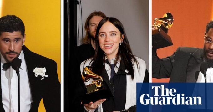 Bad Bunny e Kendrick Lamar ganharam importantes prêmios Grammy em uma noite acusada de desobediência política, enquanto os músicos agiam contra a repressão mortal de Donald Trump ao ICE. Billie Eilish, que escolheu a música do ano para Wildflowers, usou seu discurso para declarar: ‘Ninguém é ilegal nas terras roubadas.’ O prêmio de Melhor Artista Revelação foi para Olivia Dean, apresentado pelo vencedor do ano passado, Chappell Rhone. ‘Venho aqui como neta de um imigrante’, disse Dean sob aplausos