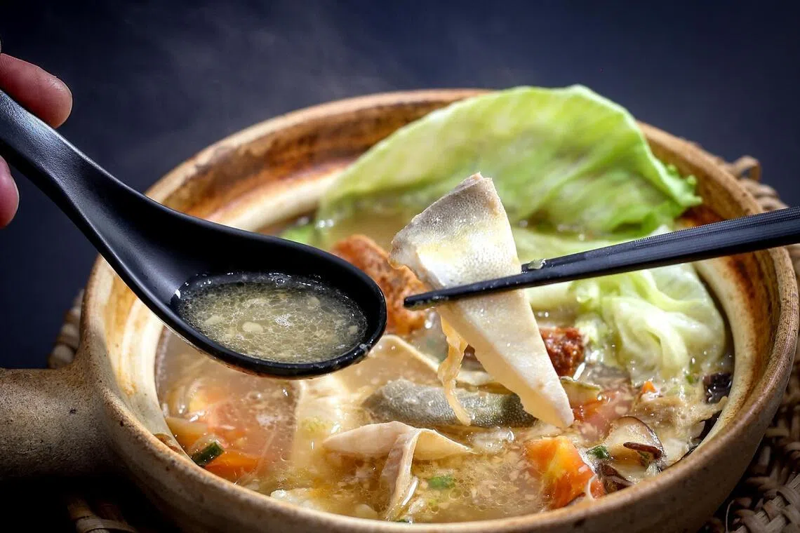 E a sopa parece conter um pomfret inteiro, carnudo e recém cozido. Quando estiver na mesa, aqueça tudo de uma vez para evitar que cozinhe demais devido ao calor residual.