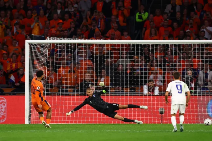 Logo depois de Julian Timber acertar a trave, o chute de Justin Kluivert acertou as mãos do finlandês Miro Tenjo, e Depay converteu o pênalti que se seguiu.