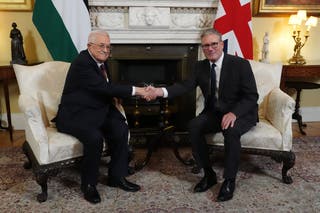 O líder da autoridade palestina Mahmoud Abbas discute com o primeiro -ministro do Reino Unido, Sir Care Starmer, na Downing Street.