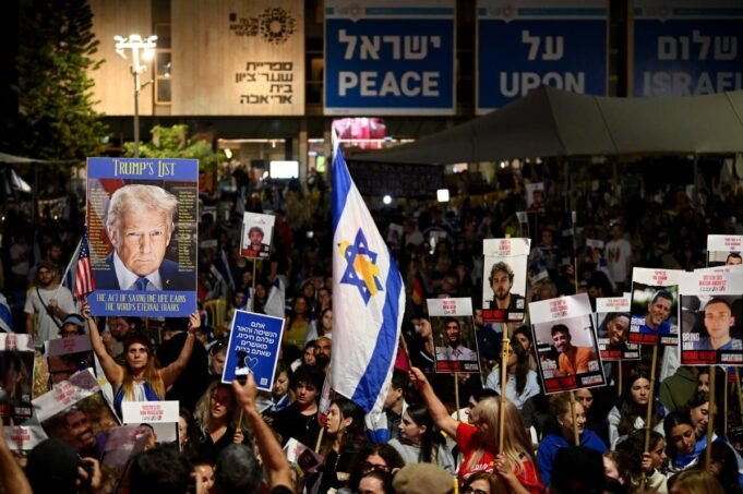 Imagens da CNN mostram que as bandeiras israelenses lotadas estão inclinadas para Reim e Tel Aviv, onde imagens de vídeo mostraram uma enorme faixa em uma praia da cidade com a palavra “obrigado” e uma silhueta semelhante à do presidente Trump.