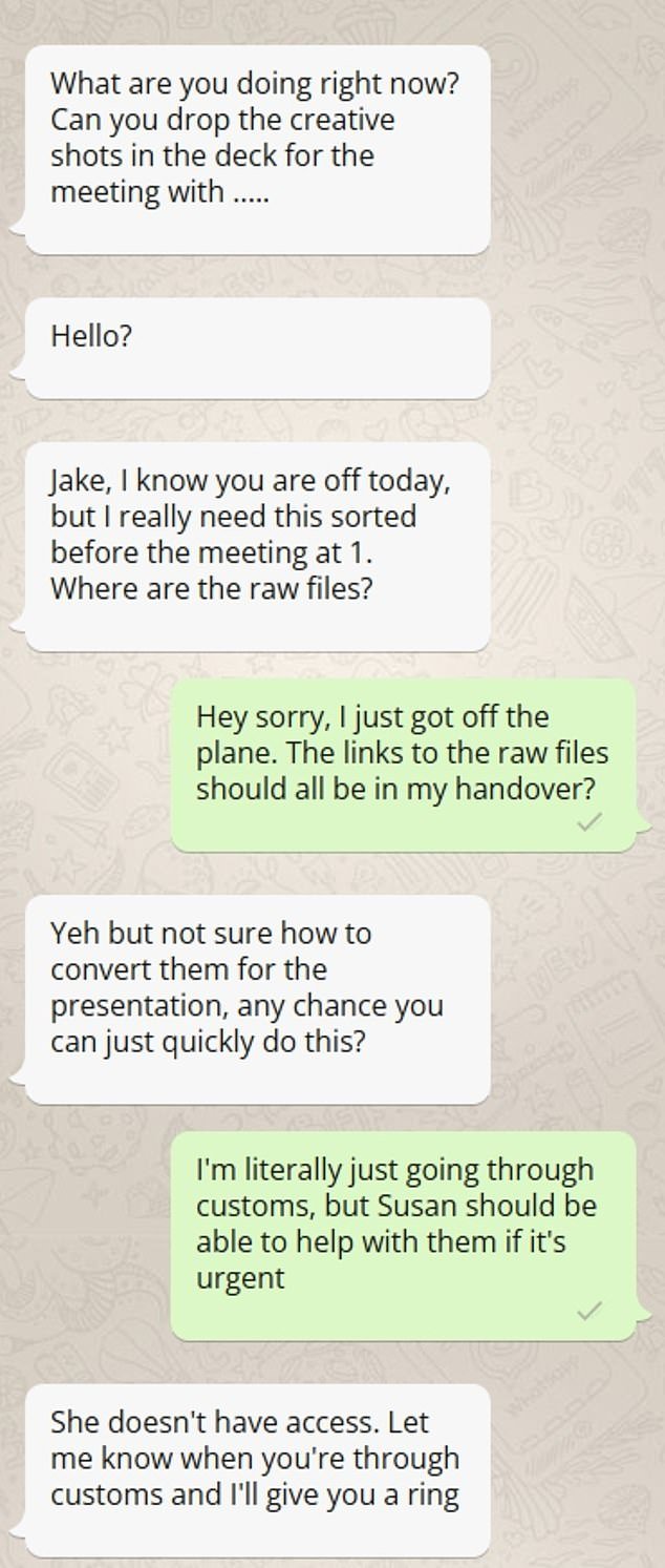 ‘Eu sei que você está de folga hoje, mas eu realmente preciso resolver isso antes da reunião da 13h. Onde estão os arquivos brutos?’