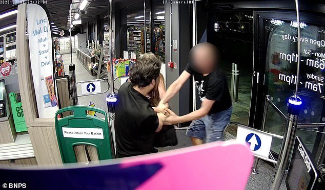 Mas em outros lugares, as lojas estão lutando de volta, lutando com um lojista com dois bravos guardas de segurança, é visto tentando roubar garrafas de bebidas fracassadas de um maior em Hammarsith.