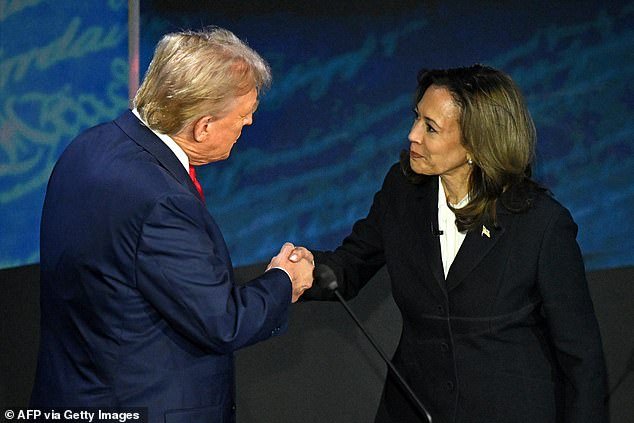 Kamala Harris (pintada à direita) foi projetada para seu debate solitário com Donald Trump para ter um chocante por trás do aborto (à esquerda retratada)