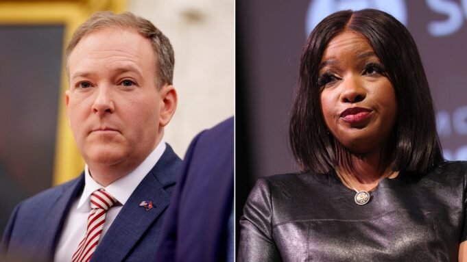 Esquerda: O administrador da EPA, Lee Zeldin, participa de uma reunião com o presidente Donald Trump e o secretário-geral da OTAN, Mark Rutte, no Salão Oval da Casa Branca, em 13 de março de 2025, em Washington, DC; À direita: A representante Jasmine Crockett fala durante The Color of Conversation durante o Festival de Cinema Afro-Americano de Martha’s Vineyard de 2025 no Martha’s Vineyard Performing Arts Center em 7 de agosto de 2025 em Martha’s Vineyard, Massachusetts. (Esquerda: Andrew Harnick/Getty Images; Direita: Arturo Holmes/Getty Images)