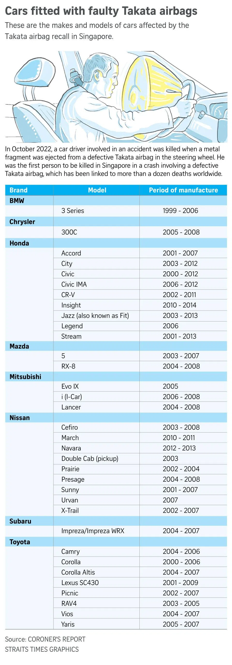 Isto ocorre 11 anos após a notícia de que mais de 75.000 veículos em Cingapura foram afetados por um recall global. Embora a Takata seja uma empresa japonesa, todas as grandes montadoras usam airbags.