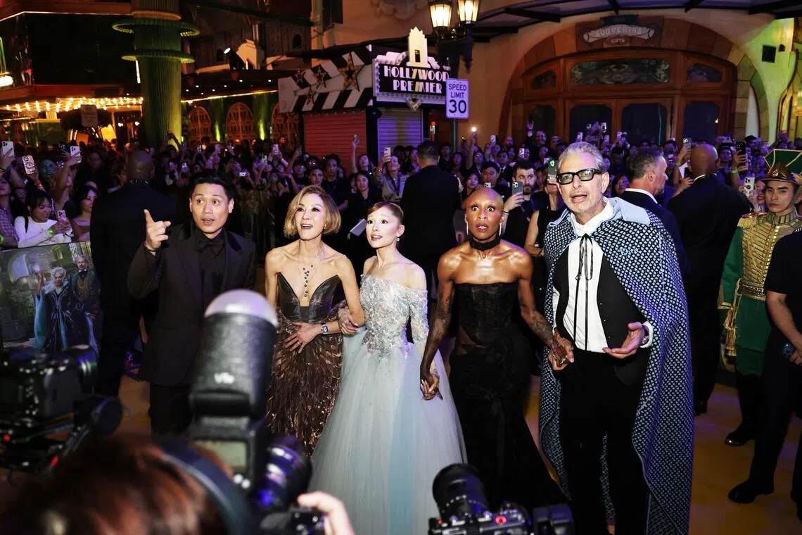 (Da esquerda) O diretor de Wicked: For Good Jon M. Chu e as estrelas Michelle Yeoh, Ariana Grande, Cynthia Erivo e Jeff Goldblum compareceram à estreia em Cingapura no Universal Studios Singapore em 13 de novembro.