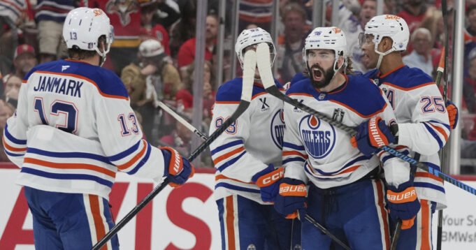 Leon Drysitol marcou na quarta vez dos play-offs, e o petróleo Edmonton derrotou o Florida Panthers por 5-4 na final da Stanley Cup na noite de quinta-feira, empatou a série, apagou uma deficiência de três gols e retornou após o atraso.