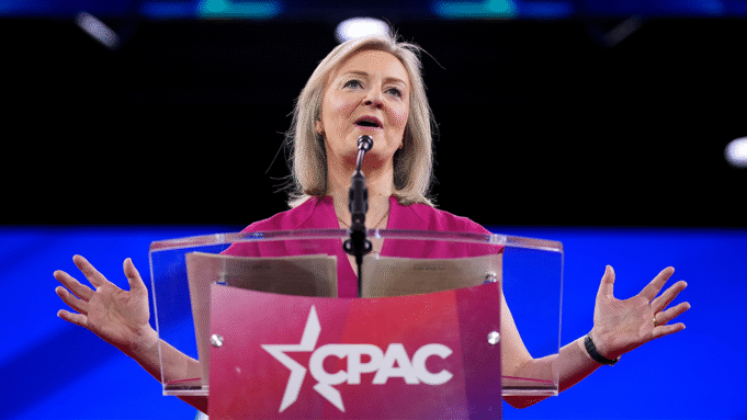 A ex-primeira-ministra do Reino Unido, Liz Truss, fala na Conferência de Ação Política Conservadora (CPAC) em 20 de fevereiro de 2025 em Oxon Hill, Maryland. (Andrew Harnick/Imagens Getty)