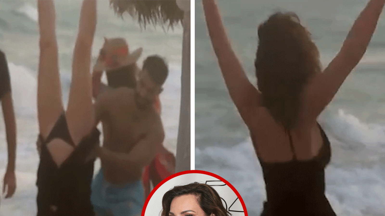 Ela tem um homem segurando suas pernas – então ela não está exatamente se segurando como uma artista de circo. Porém, ela deu um show e tanto… porque quando o encobrimento caiu pelo corpo, revelou a minúscula parte de baixo do biquíni que deixou pouco para a imaginação.