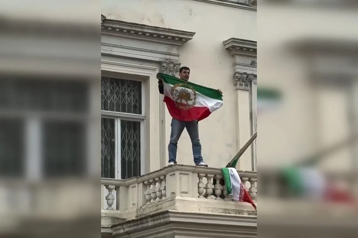 Um vídeo postado nas redes sociais mostrou um homem na varanda da embaixada perto do Hyde Park substituindo a bandeira atual pela bandeira usada durante o regime do xá deposto, enquanto centenas de manifestantes aplaudiam.
